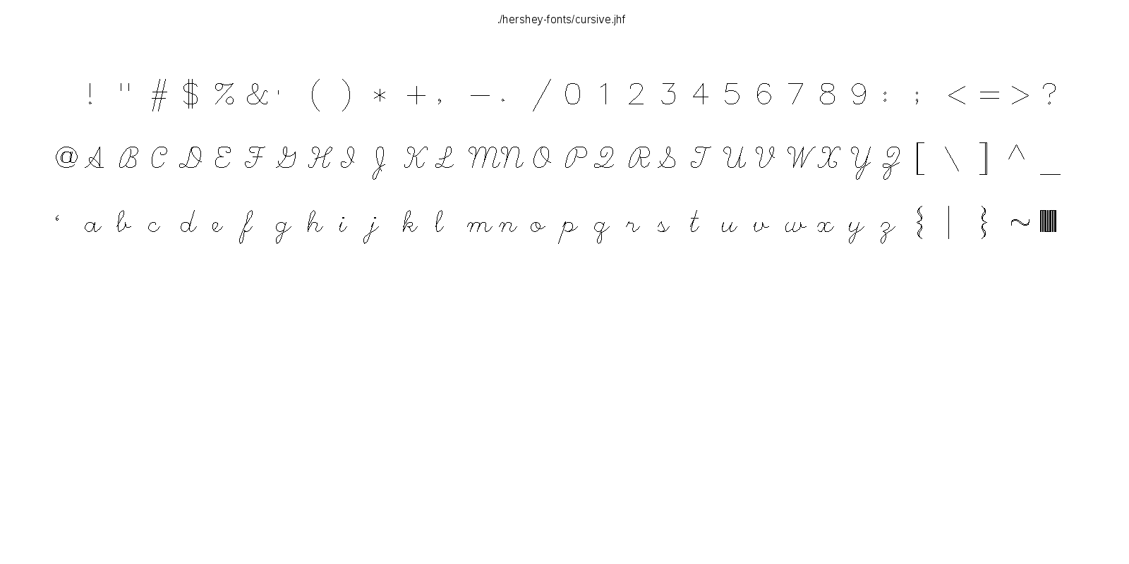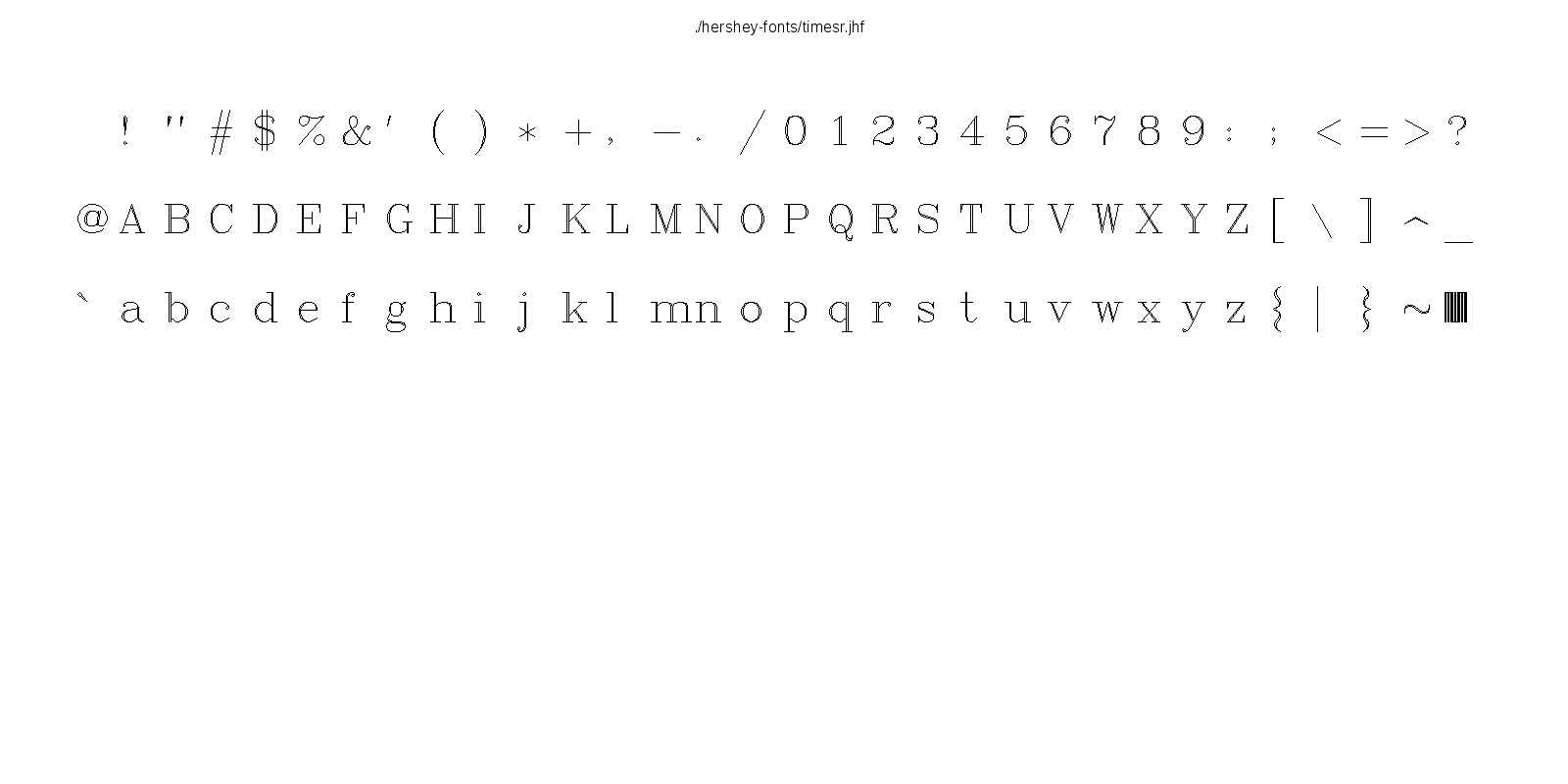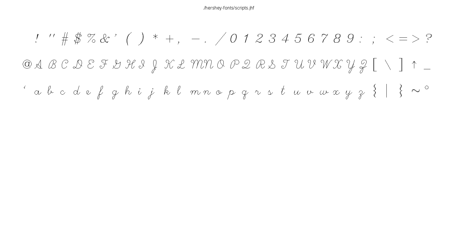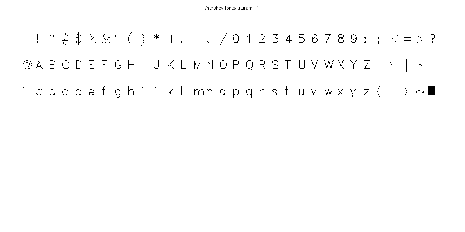 This hershey-fonts package includes Kamal Mostafa's libhersheyfont (a 2013 GPL C library for loading Hershey font files), a gnuplot front-end and other utility programs, as well as the Hershey font glyph data itself. The fonts were converted from Hershey's original NTIS format to the .jhf Hershey file format by James Hurt.