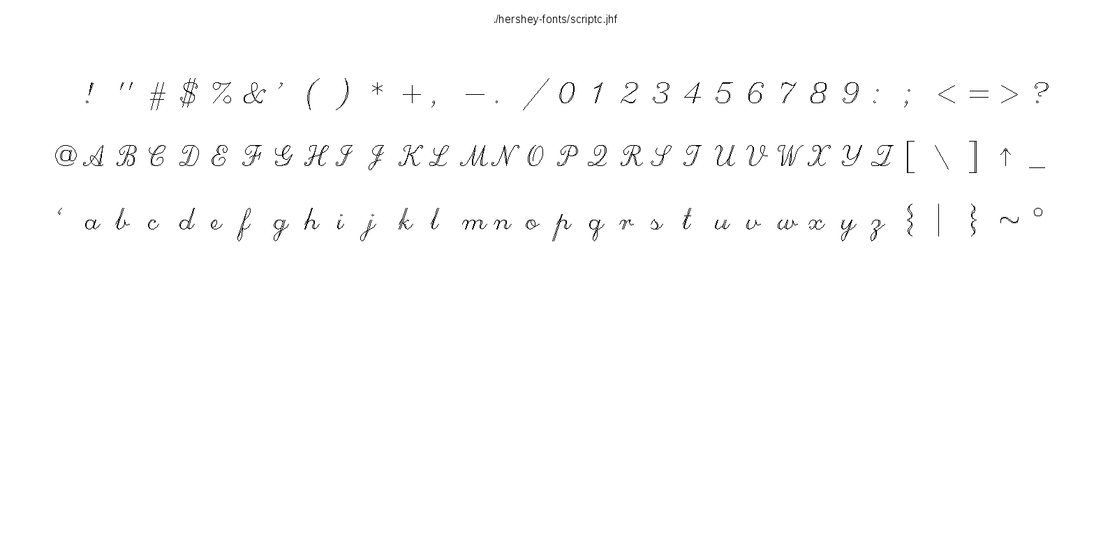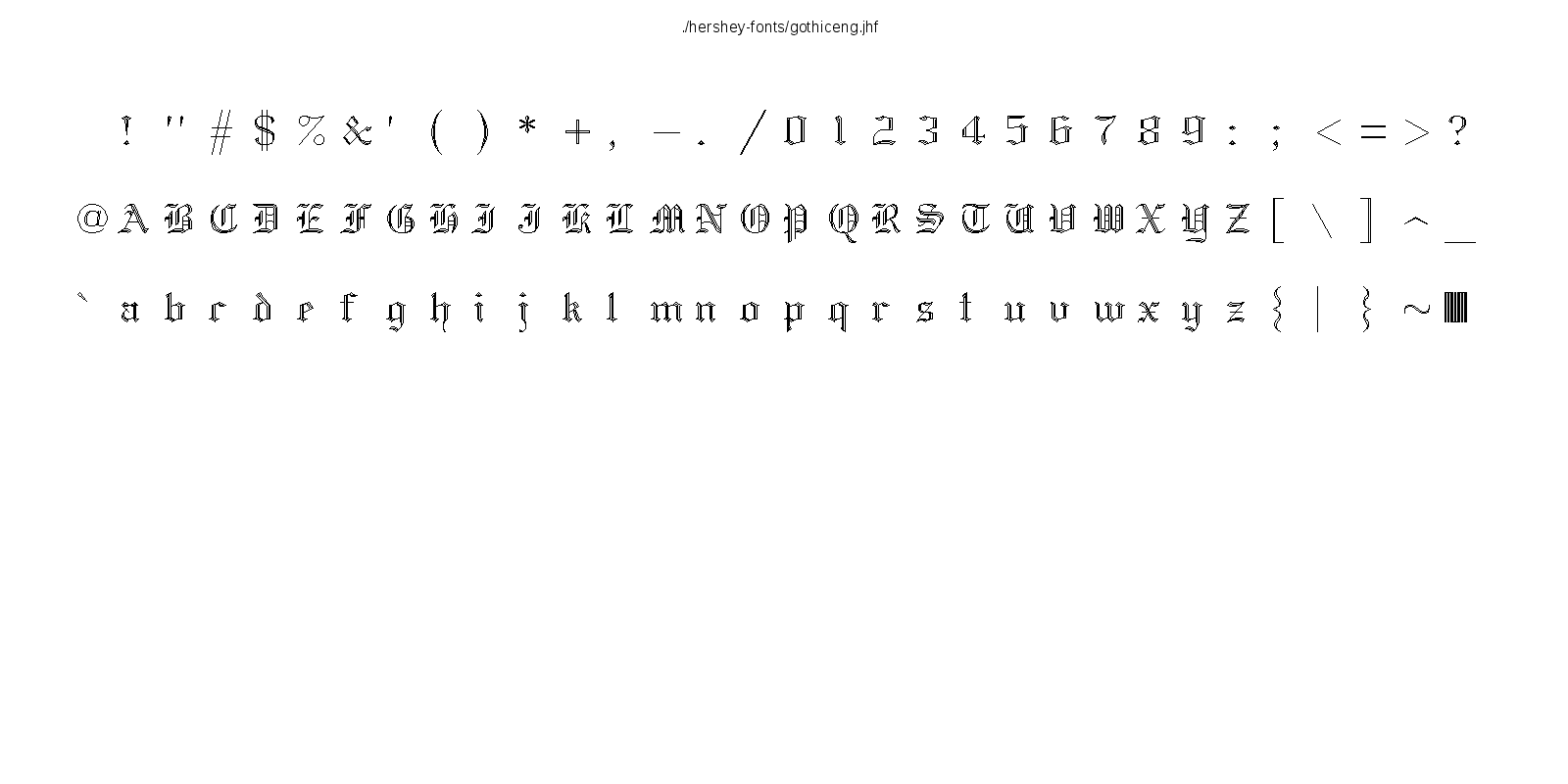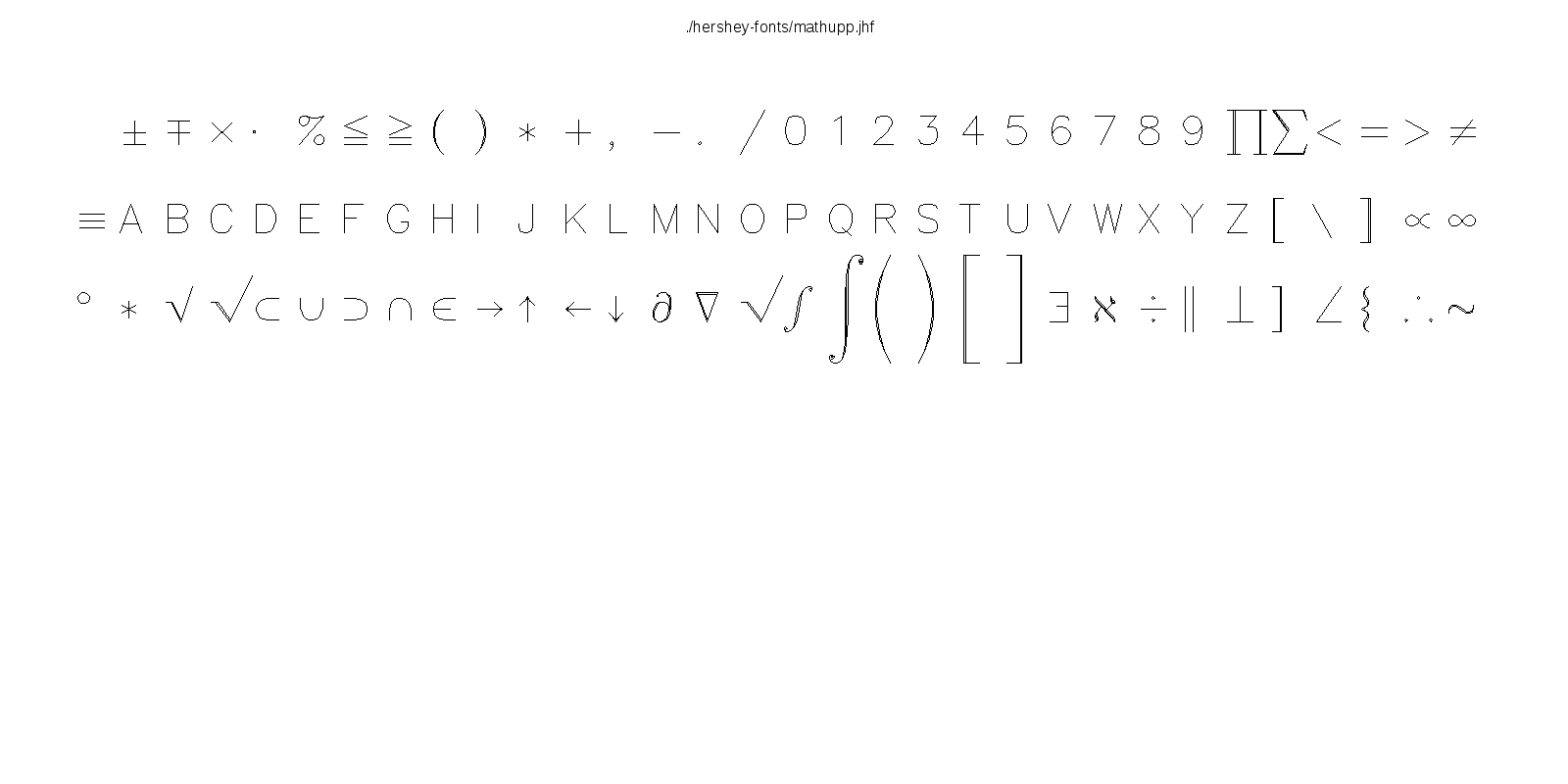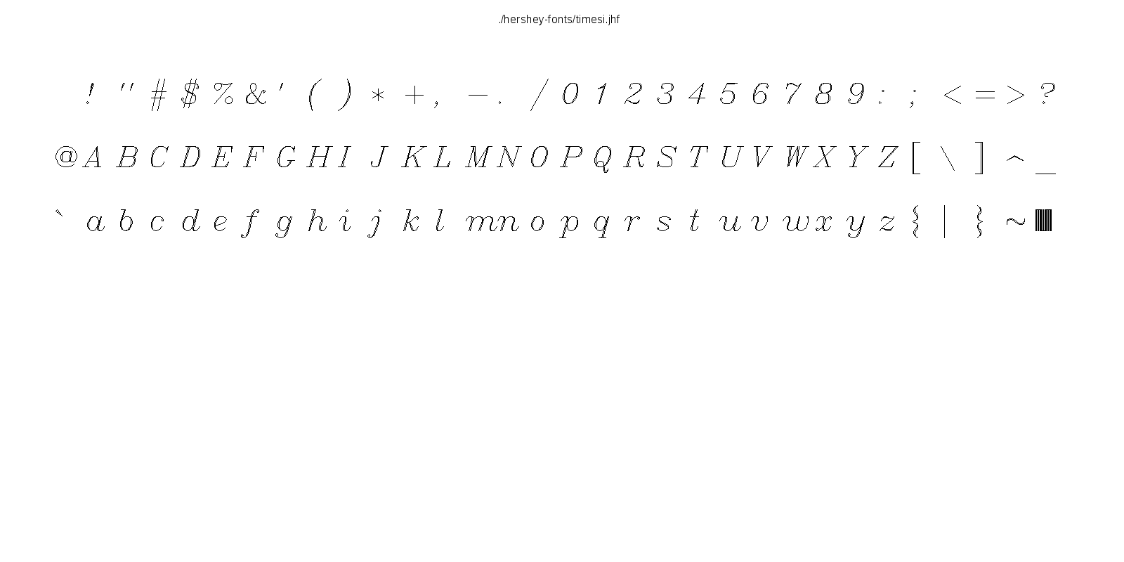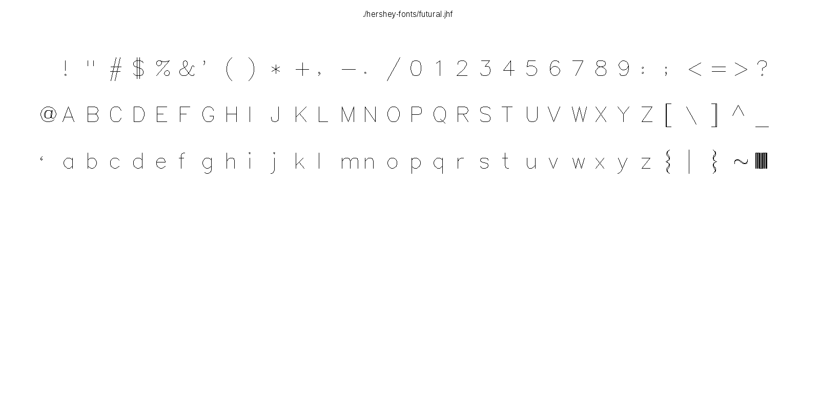 This hershey-fonts package includes Kamal Mostafa's libhersheyfont (a 2013 GPL C library for loading Hershey font files), a gnuplot front-end and other utility programs, as well as the Hershey font glyph data itself. The fonts were converted from Hershey's original NTIS format to the .jhf Hershey file format by James Hurt.