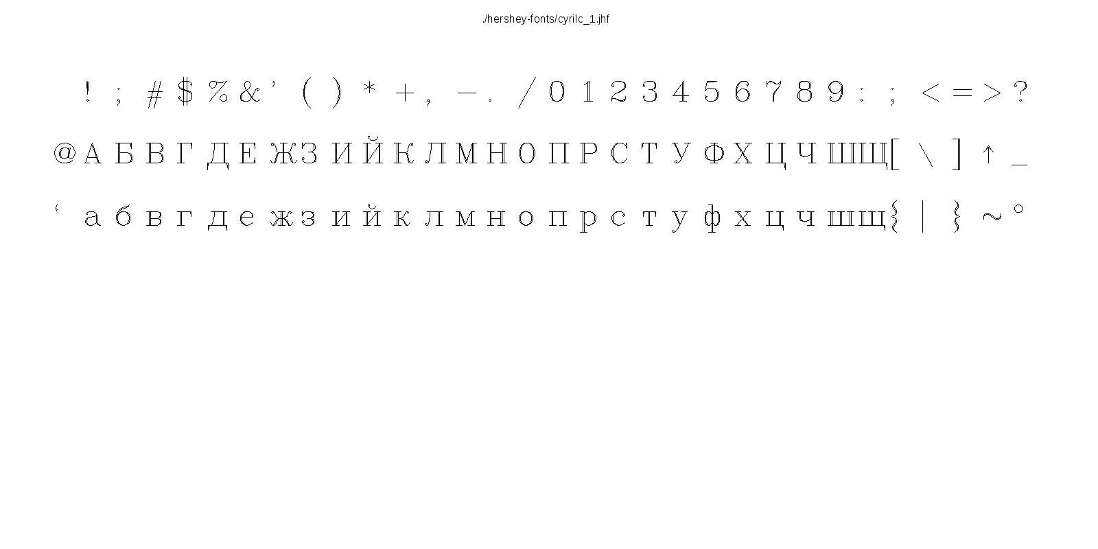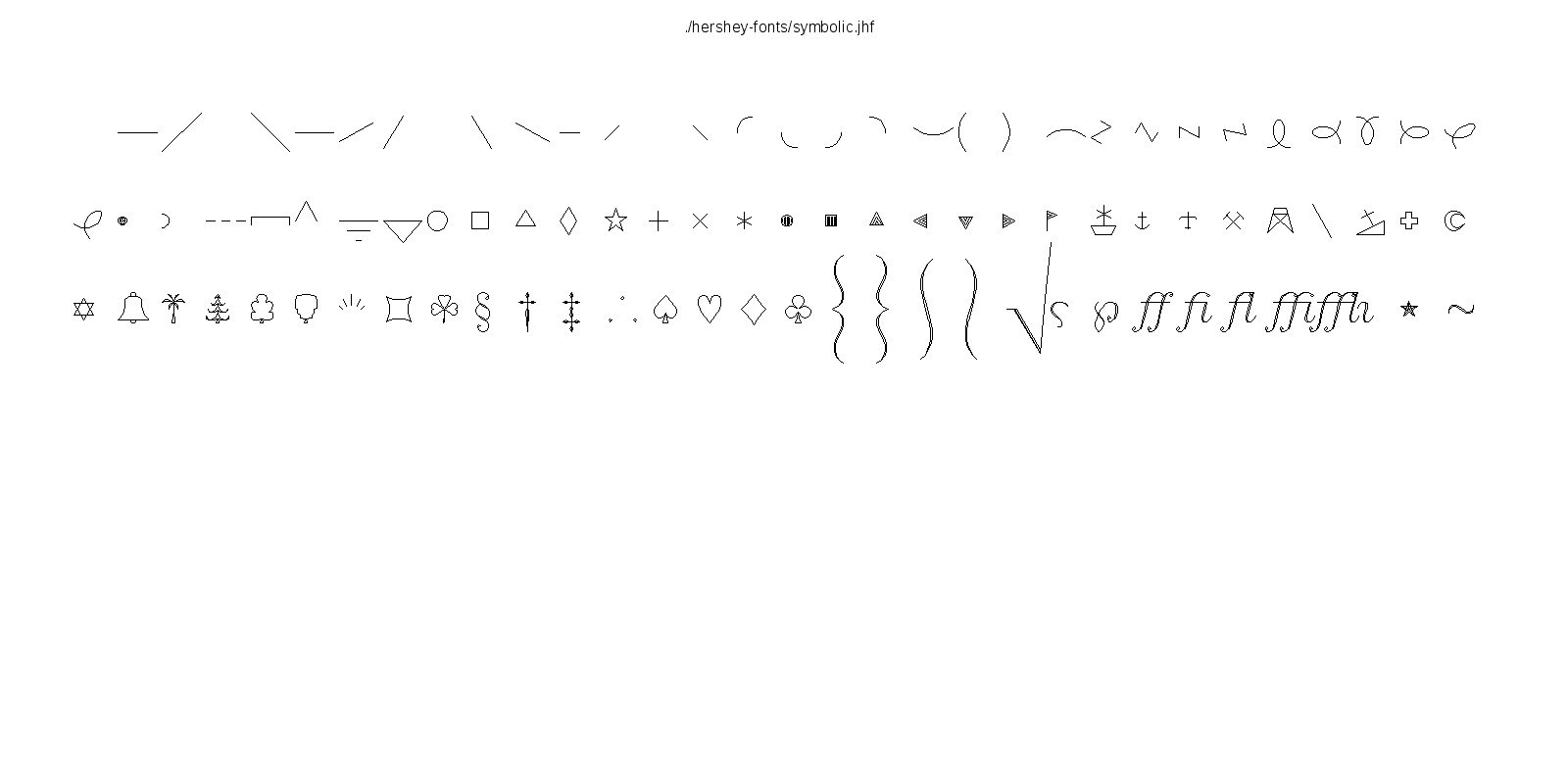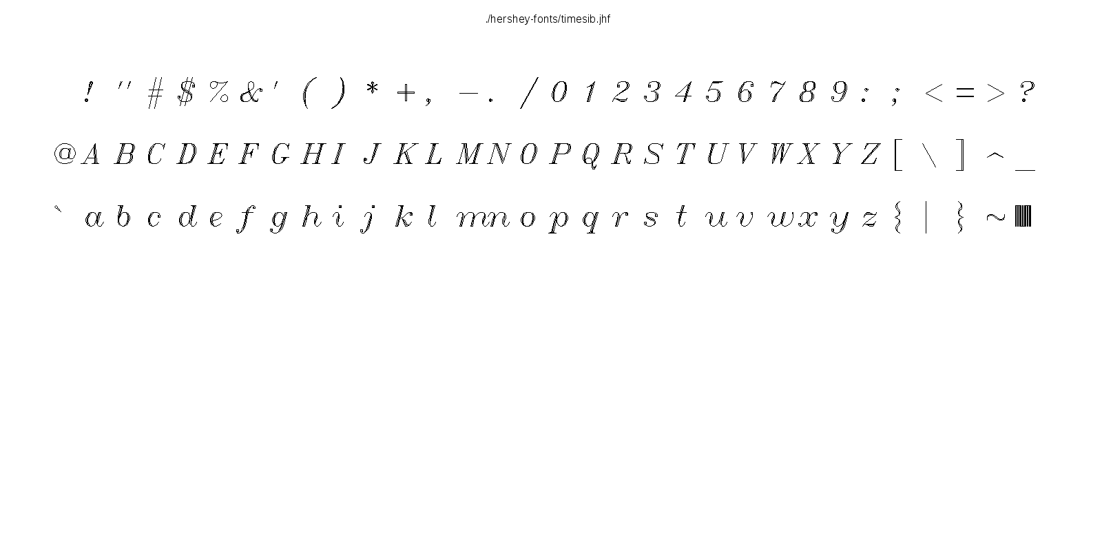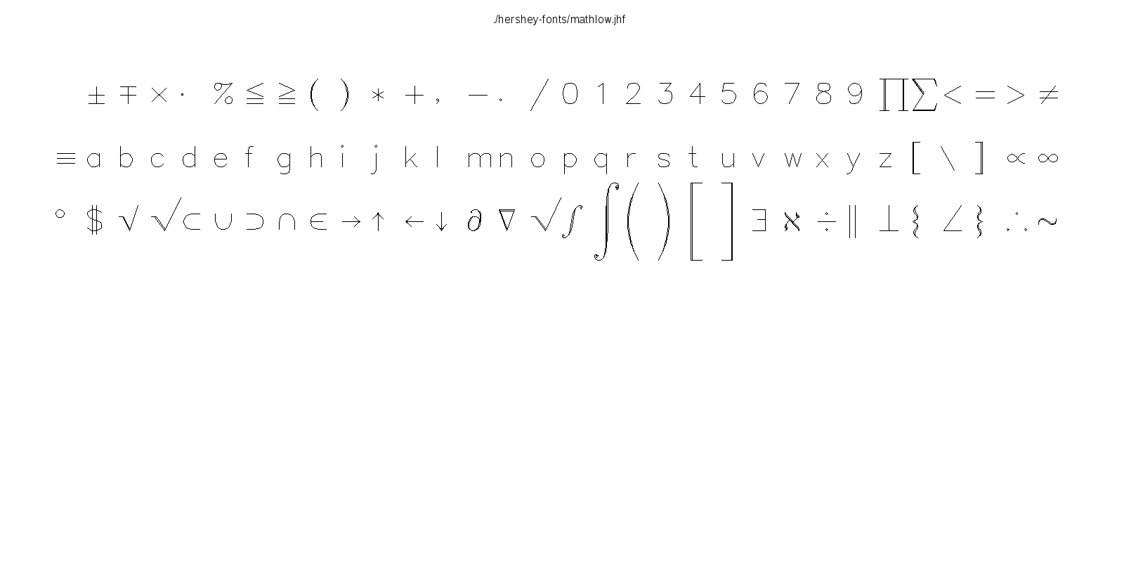 This hershey-fonts package includes Kamal Mostafa's libhersheyfont (a 2013 GPL C library for loading Hershey font files), a gnuplot front-end and other utility programs, as well as the Hershey font glyph data itself. The fonts were converted from Hershey's original NTIS format to the .jhf Hershey file format by James Hurt.